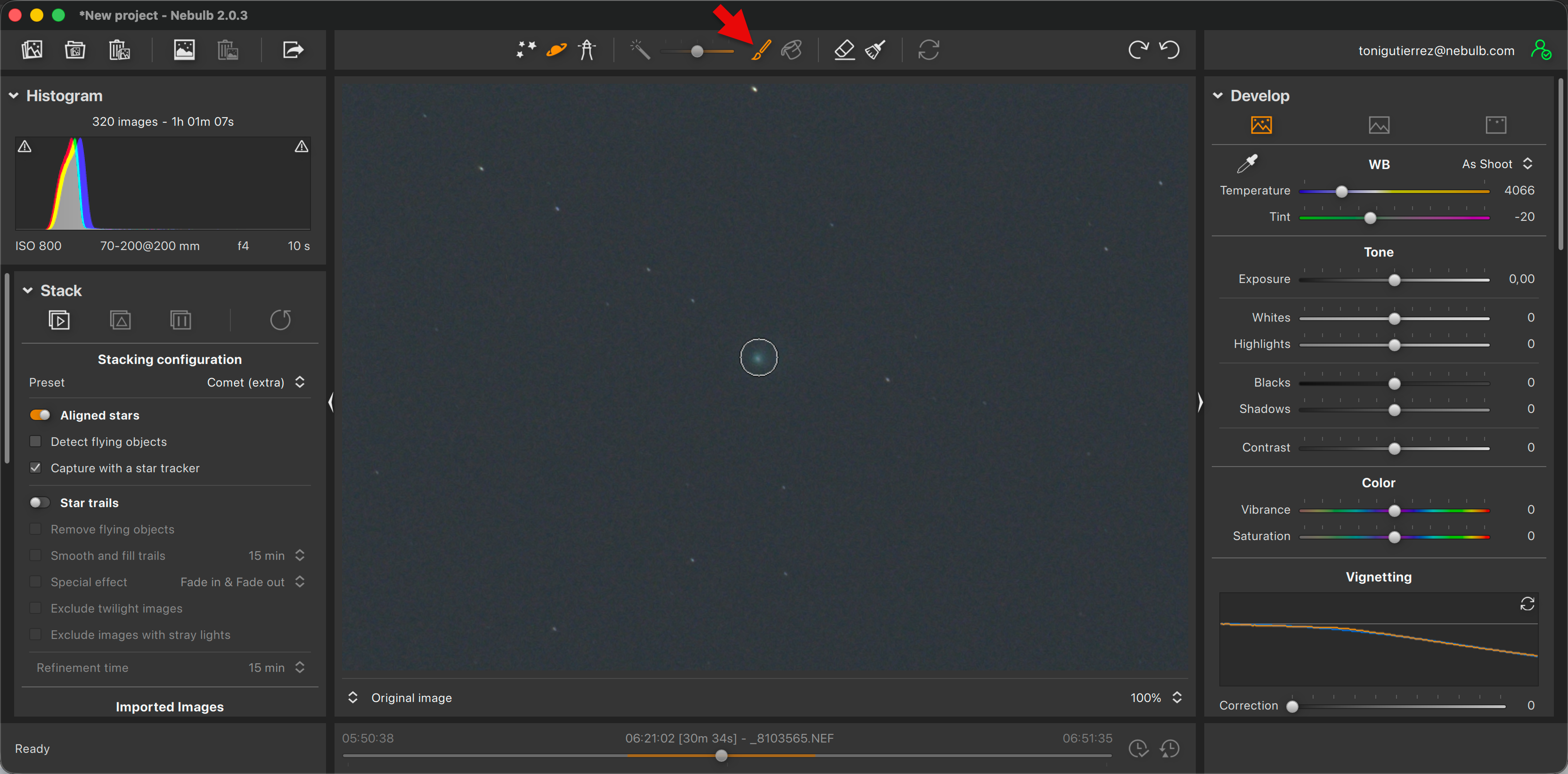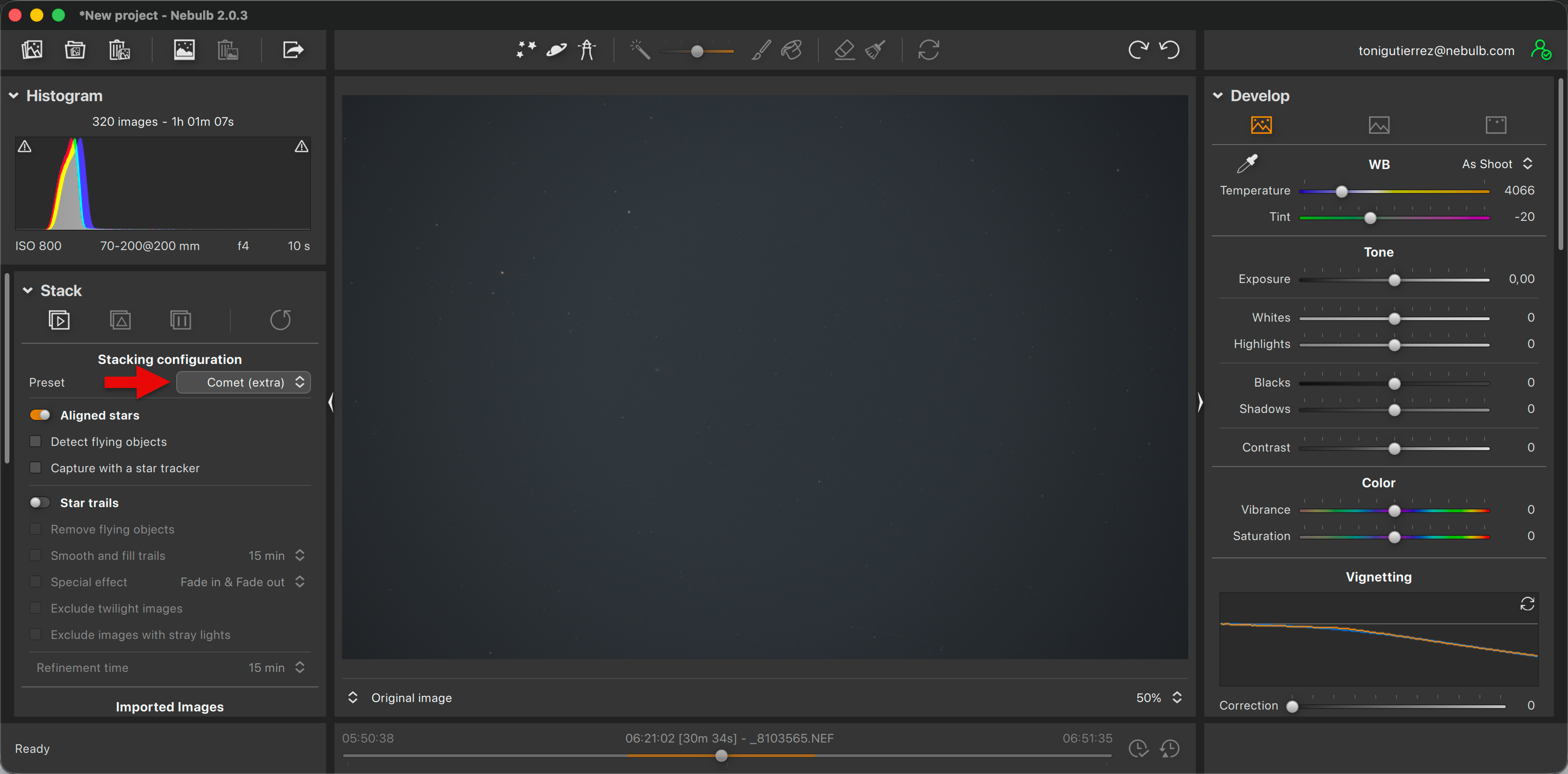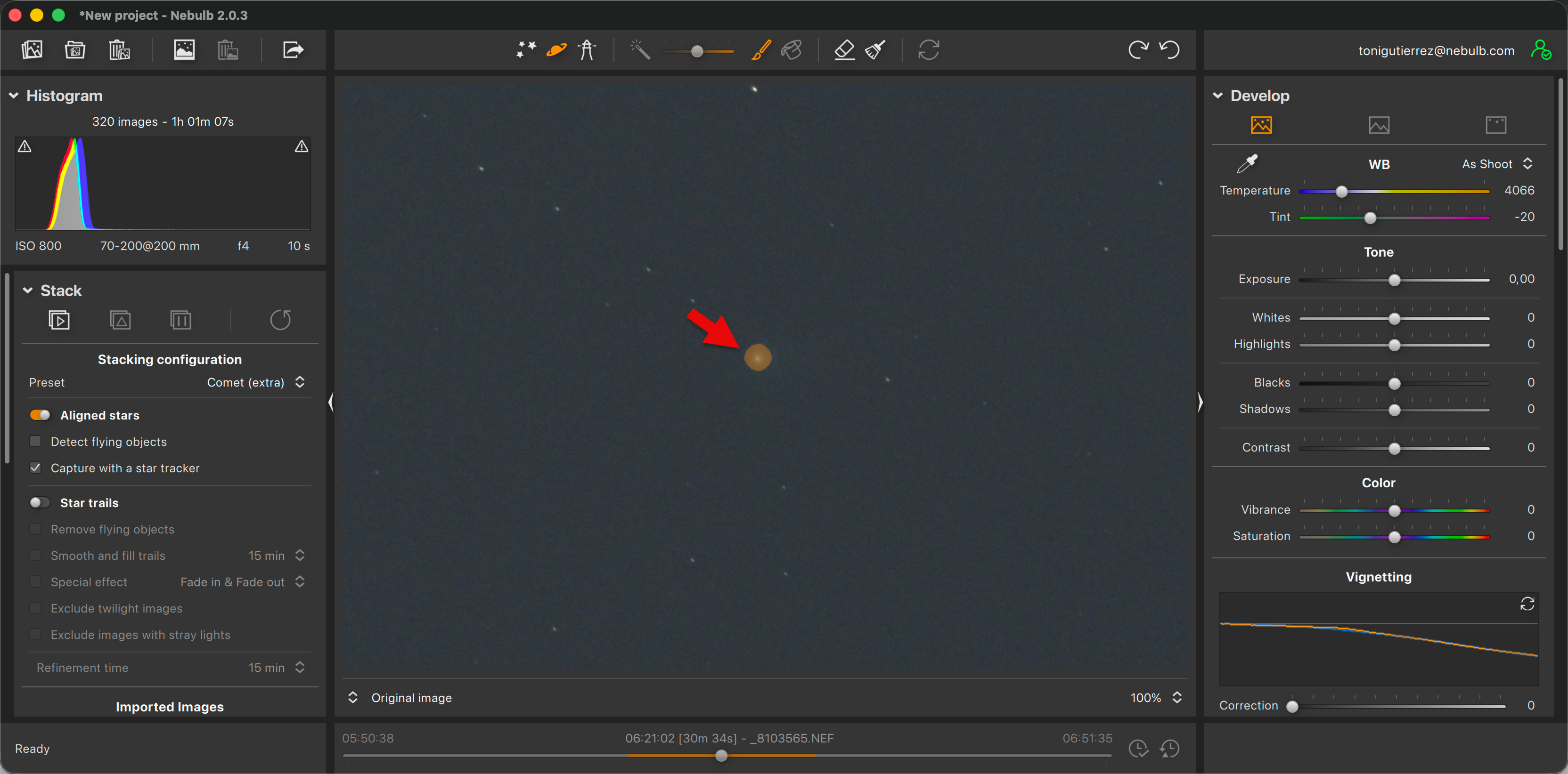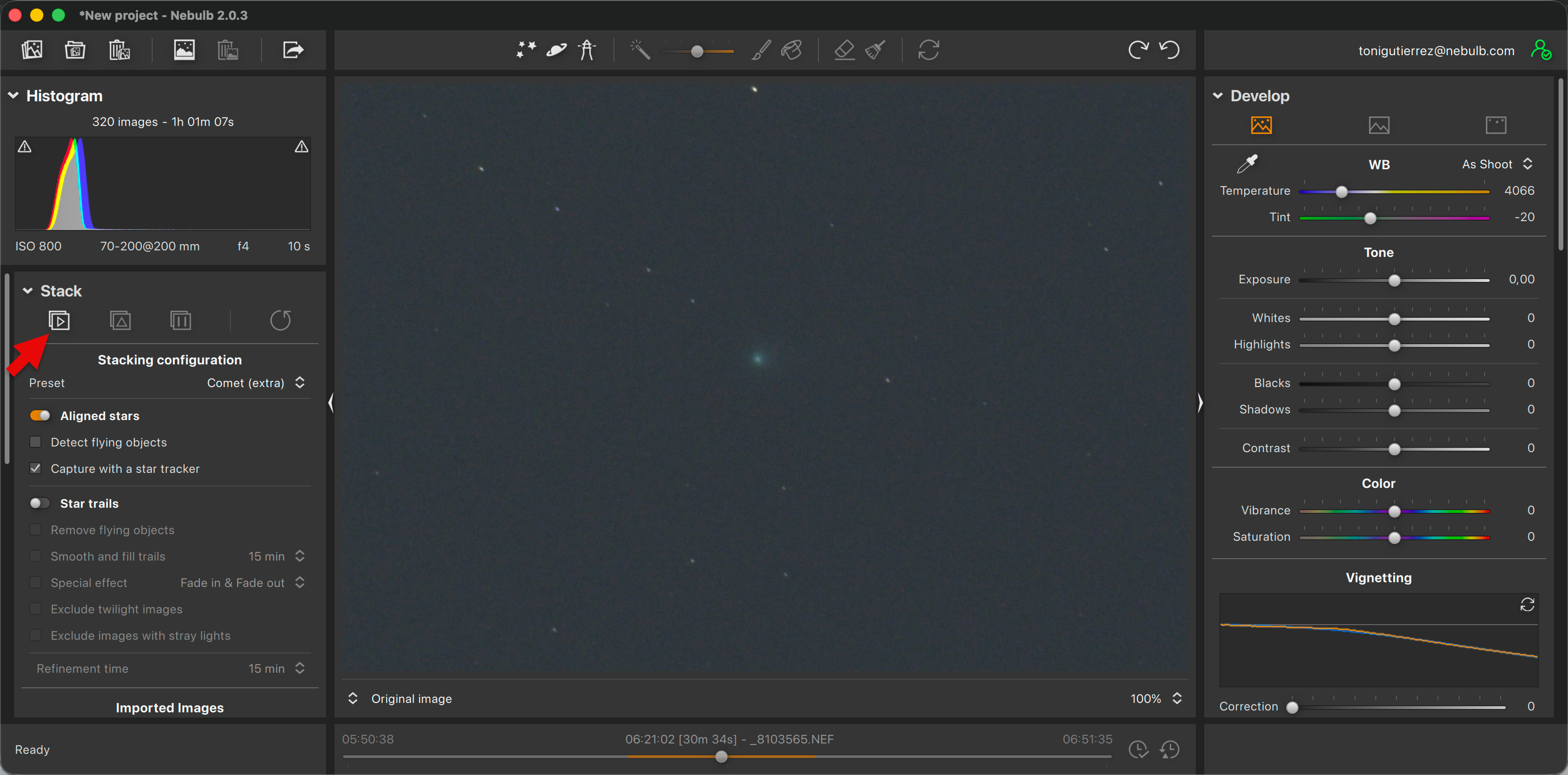 Now you can start the stacking. During this process, Nebulb will align all frames on the comet (not on the stars), resulting in a perfectly sharp comet in the final stacked image.