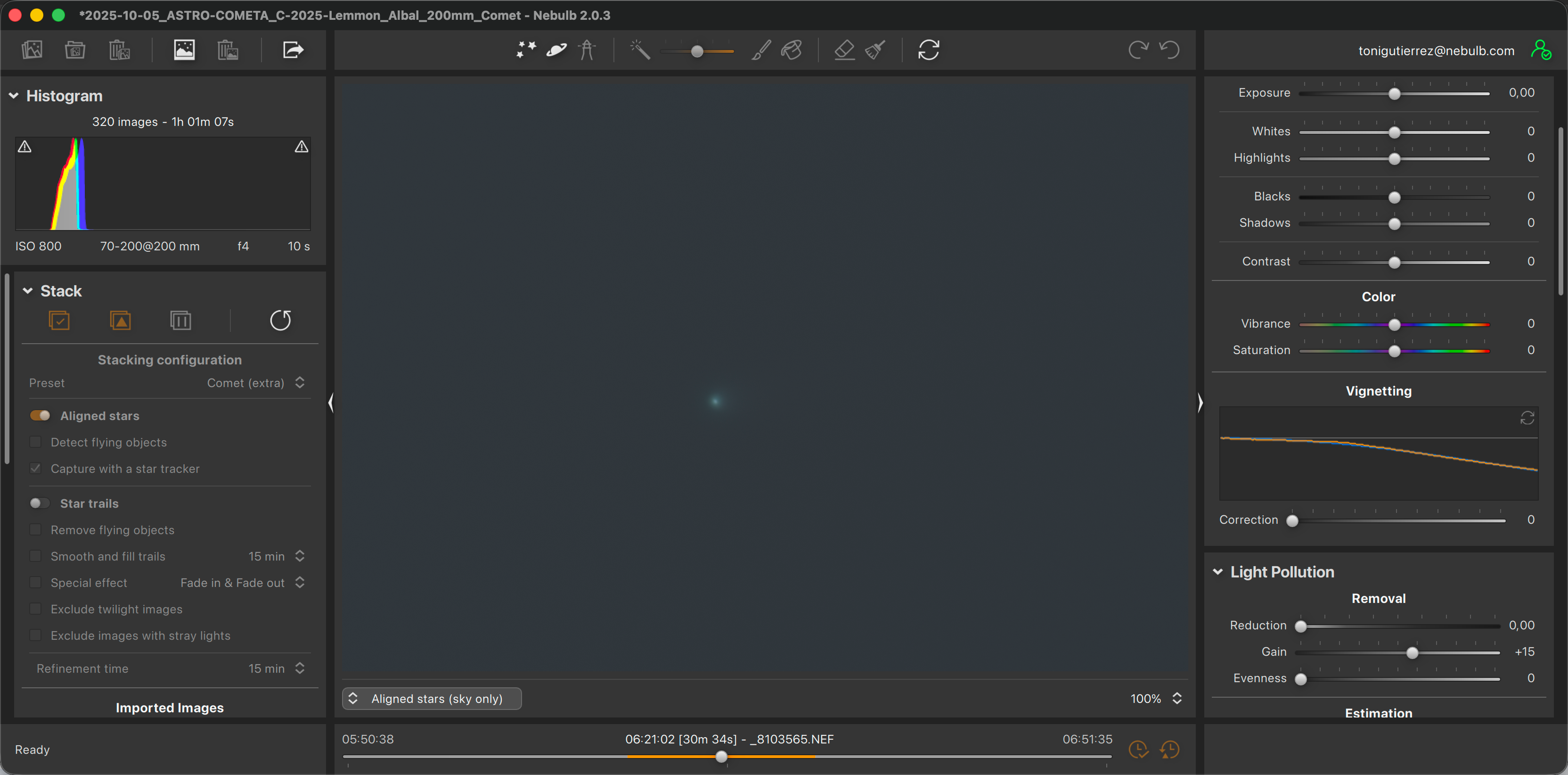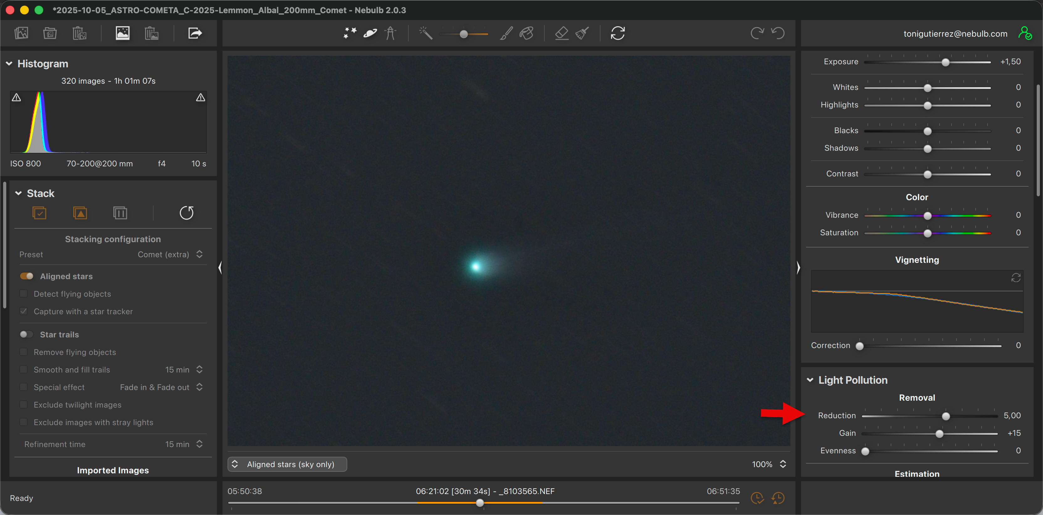 Because the final image also has very low noise (thanks to Nebulb’s stacking), you can now apply a strong light pollution reduction to bring out all possible details from the comet.