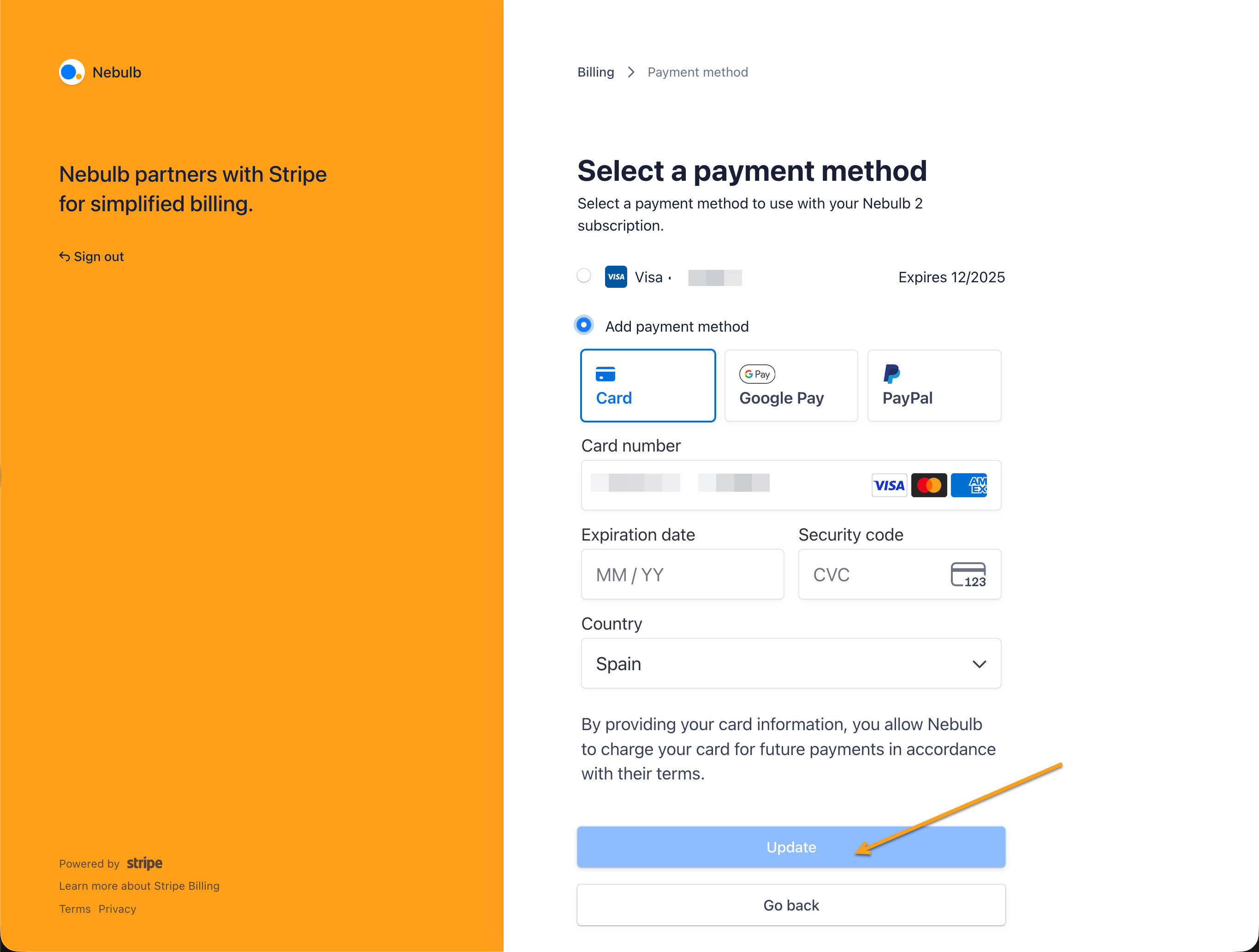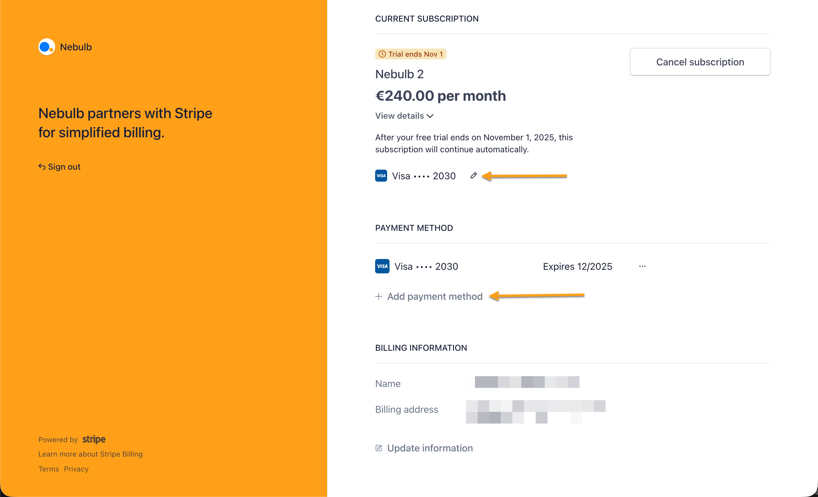 b) Click “+Add payment method” to enter additional payment methods besides the one you already have saved.