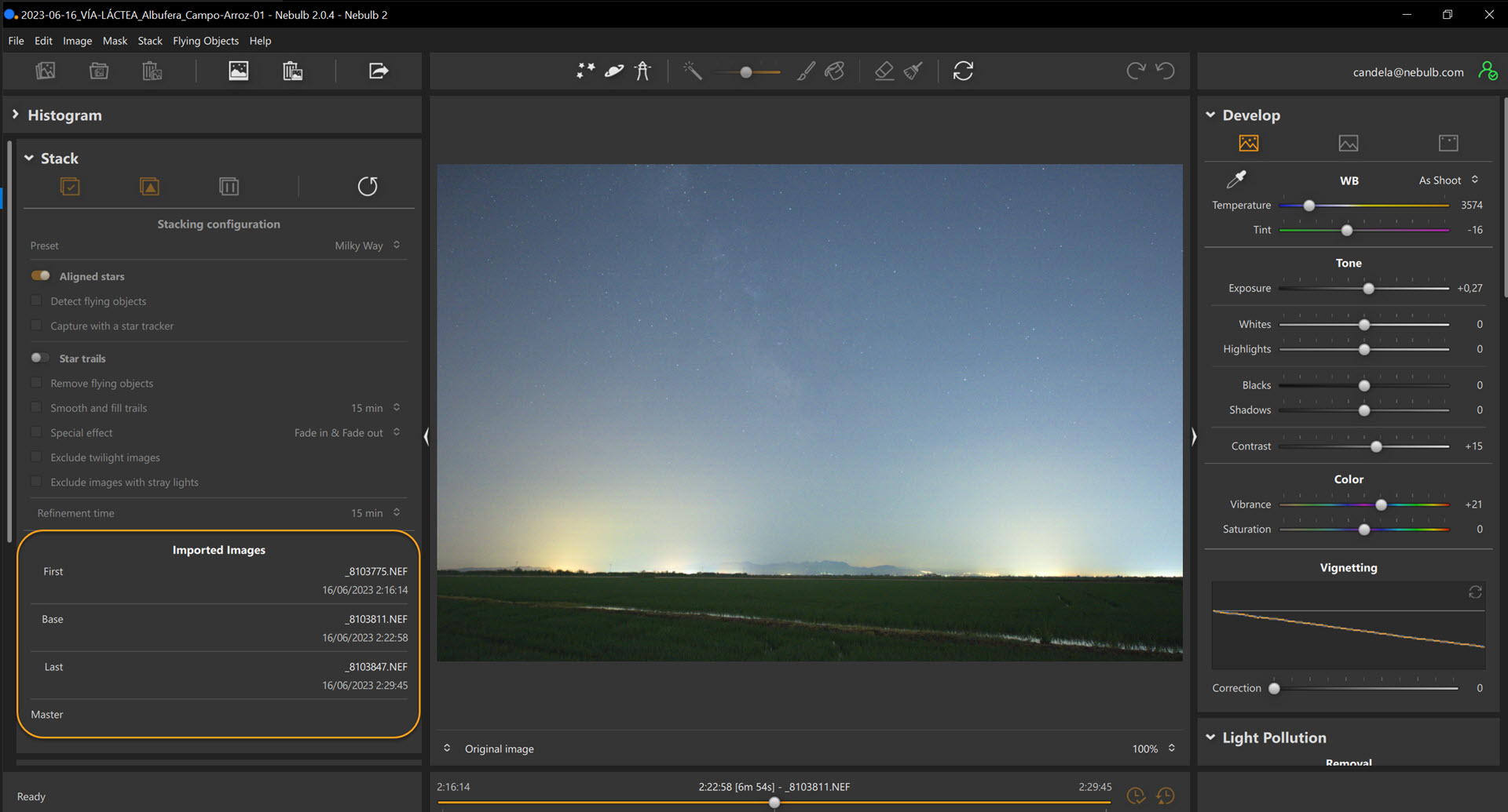 Once all the images have been imported, Nebulb will display the image selected as the base image (which is always the one that is temporarily in the middle) and in the "Import Images" section you can see the summary information of the imported images.