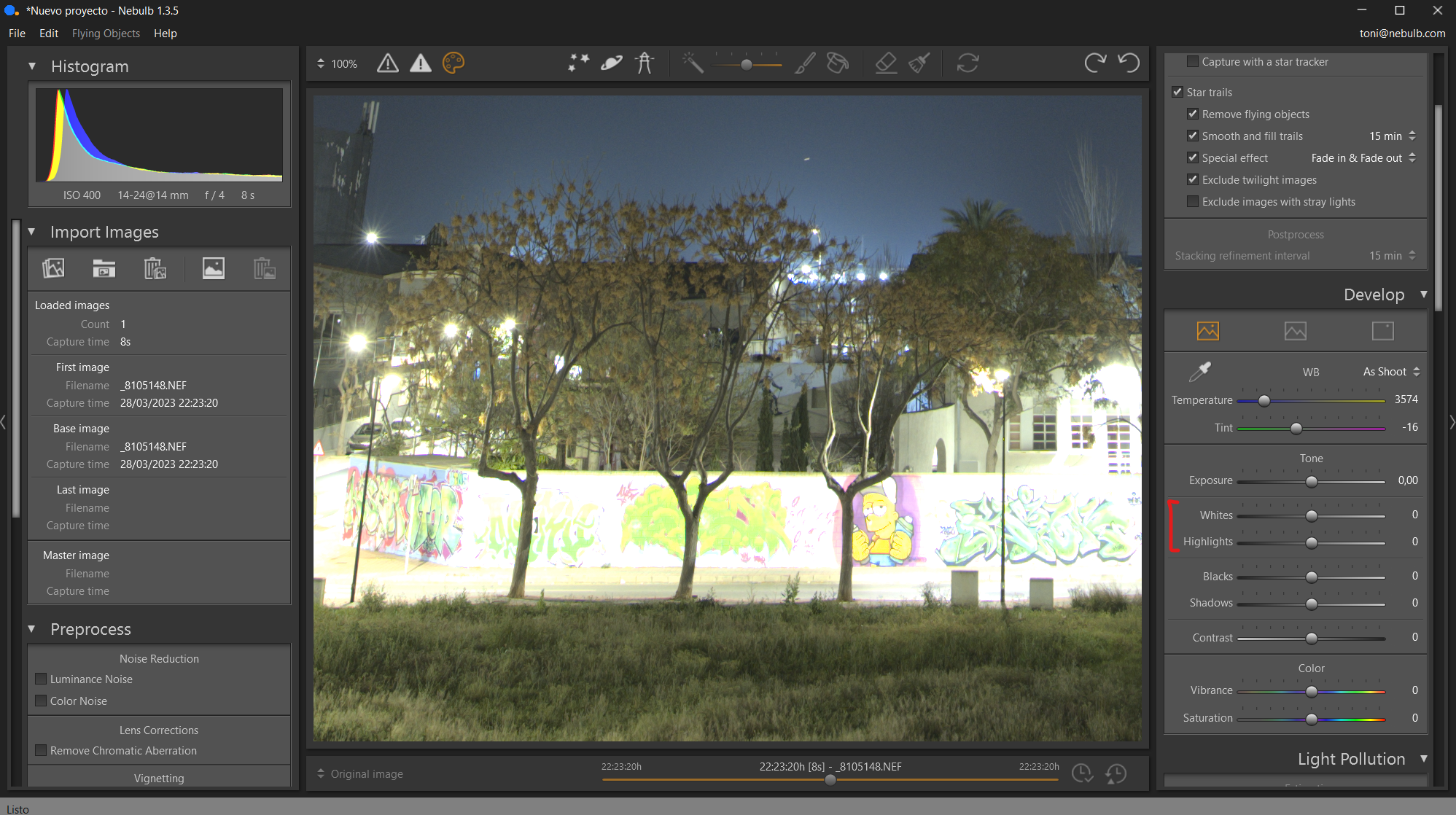 Part of the image appears very overexposed (even "burnt") due to the street lighting