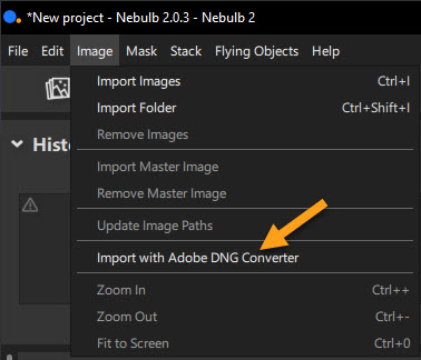 1. Go to the Image menu at the top and select Import with Adobe DNG Converter.