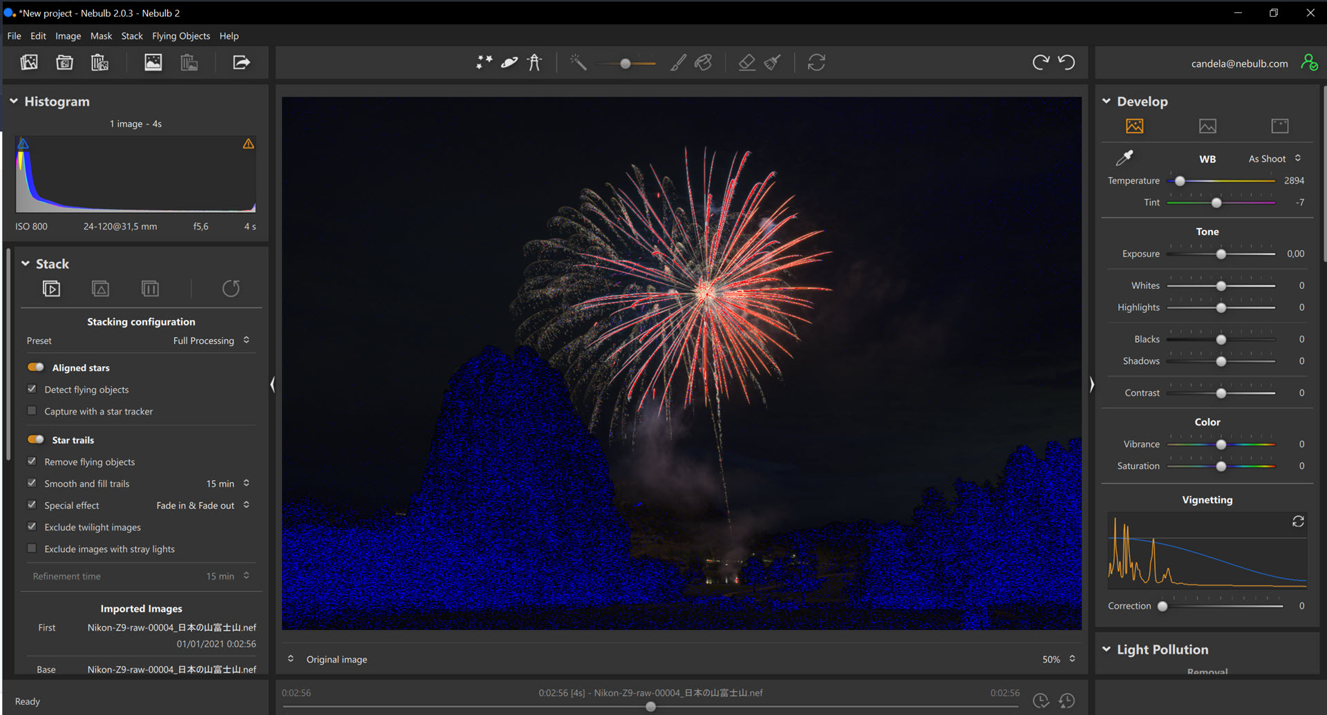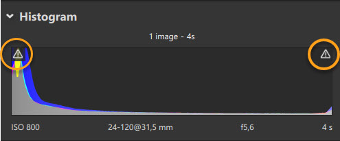 Nebulb allows you to display both the burned areas of the image (in red) and the areas that are completely black (in blue).