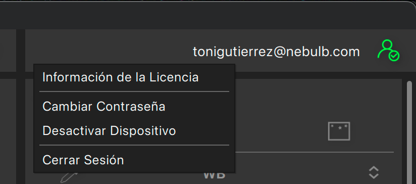 Haz clic en el botón de la esquina superior derecha de Nebulb (donde se muestra el correo asociado a tu licencia) y te aparecerá el menú de gestión de la licencia: