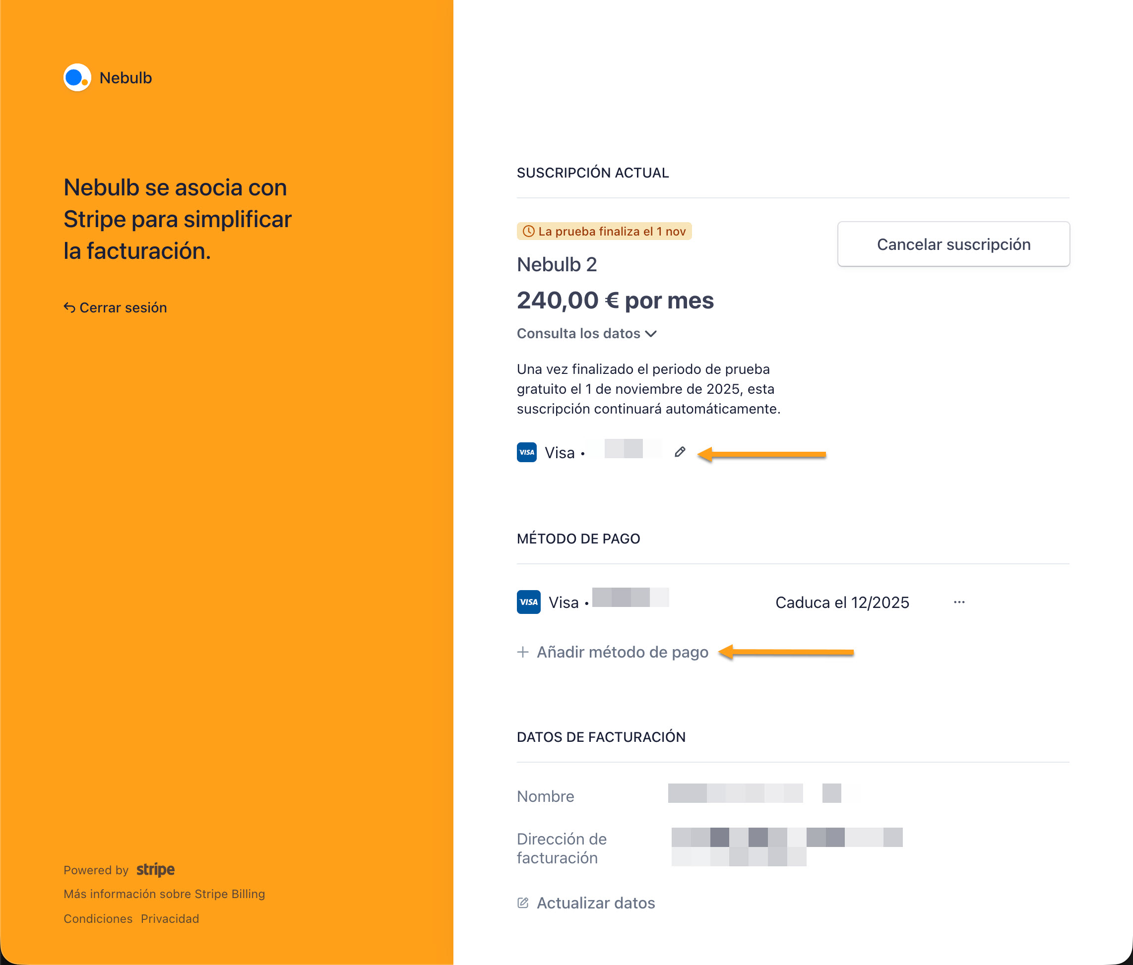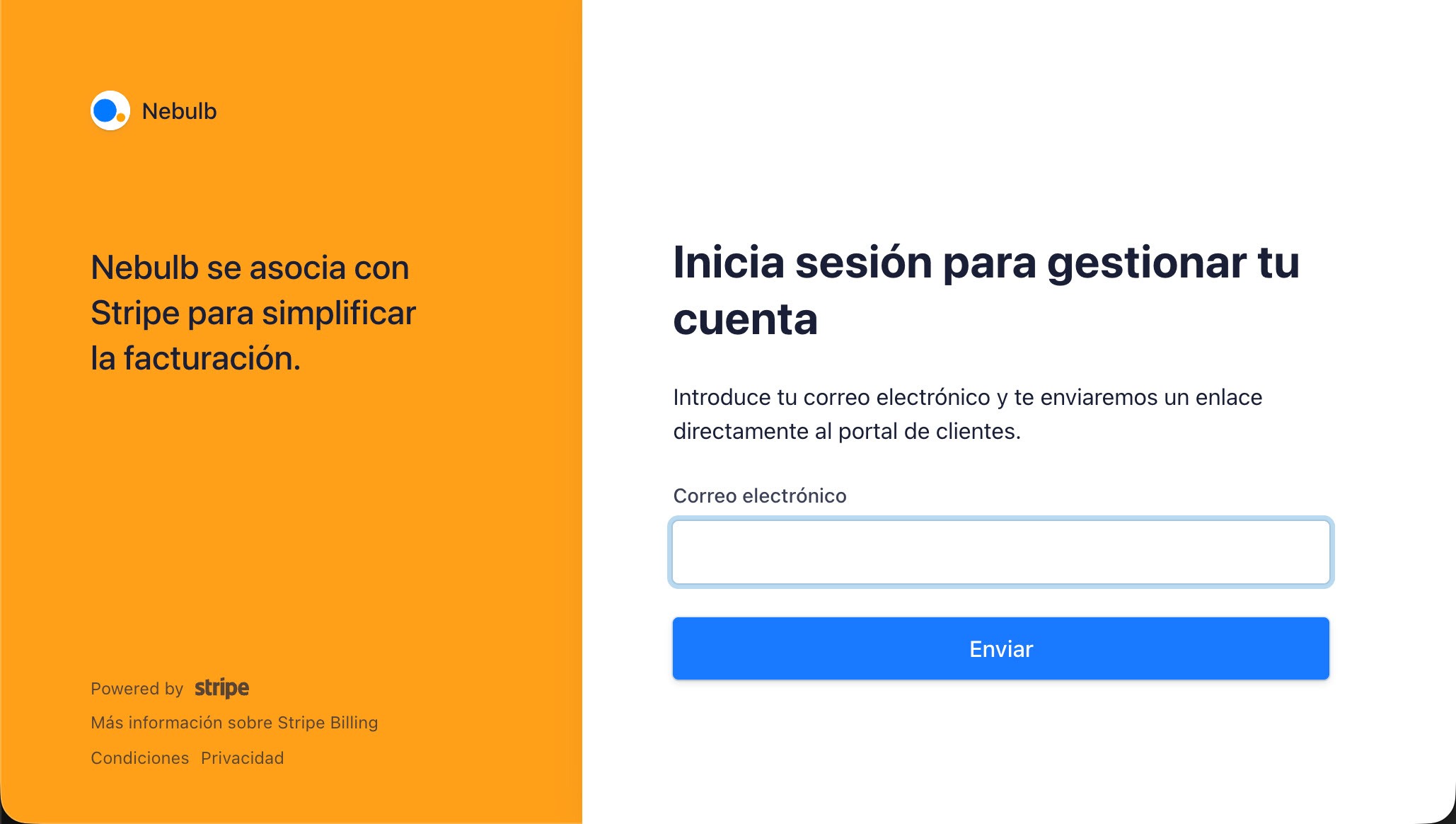 Sigue los siguientes pasos para cancelar el periodo de prueba: 1. Accede al portal de clientes mediante este enlace: Portal de clientes de Nebulb 2. Introduce el correo con el que solicitaste la prueba de Nebulb. 3. Te aparecerá una pantalla ...