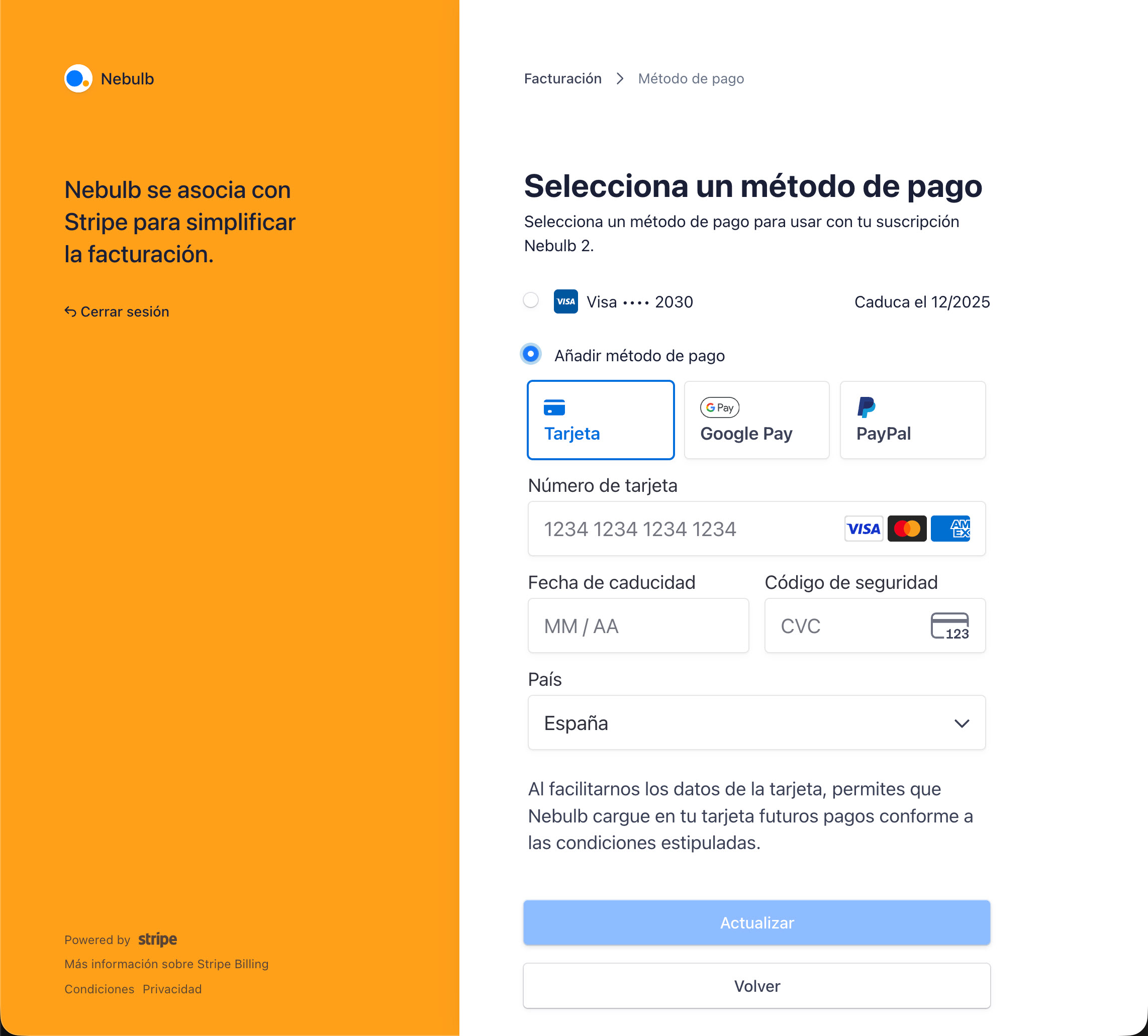 b) Pinchar en ¨+Añadir método de pago¨, para introducir más métodos de pago diferentes al que ya tienes guardado.