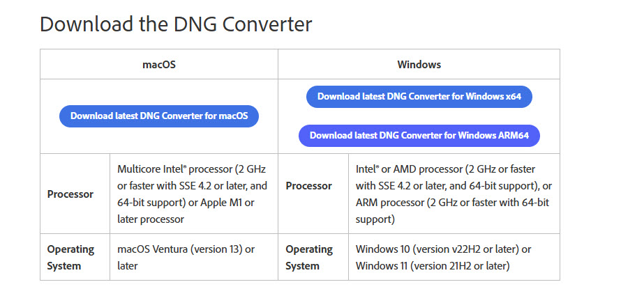 3. Al aceptar, se abrirá la página web oficial de Adobe DNG Converter. Descarga la versión que corresponda a tu ordenador (Windows x64, Windows ARM64 o macOS):