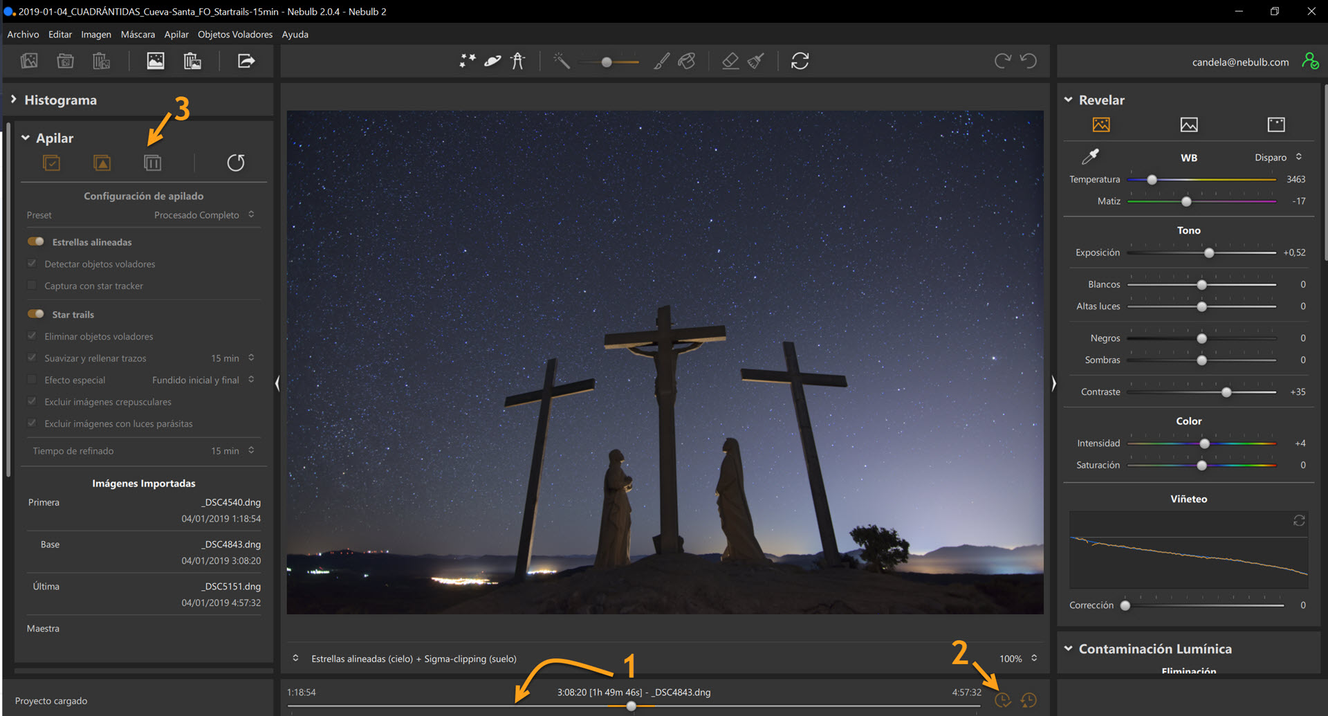 Y cuando concluye el apilado este botón se muestra en naranja y con una marca de verificación. En ese momento los módulos de post-procesado (panel derecho de herramientas) se habilitan para que el usuario pueda realizar los ajustes que desee sobre la imagen como, por ejemplo, reducir la contaminación lumínica.